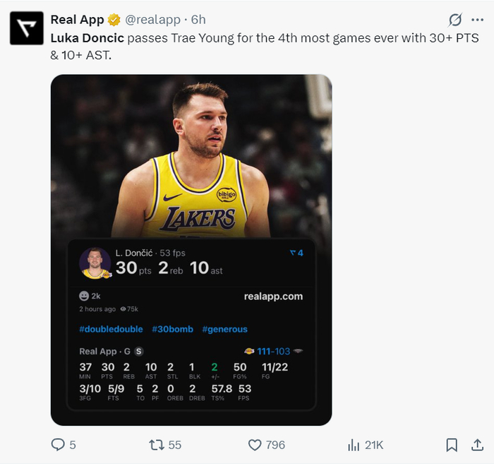 这场比赛后东契奇的30+10助攻次数超过特雷杨升至历史第四的位置,他个人的场均数据来到,场均33.5分7.9篮板8.7助攻1.5抢断0.6盖帽,命中率46.2%,三分命中率31.9%,进攻效率120.6联盟27,防守效率117.5联盟第255。