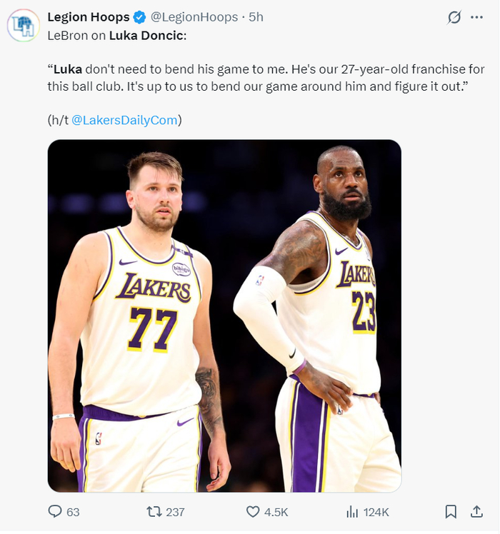 詹姆斯还是力挺东契奇:他不必为了迎合我改变自己的比赛风格,这位27岁的球员就是湖人的核心,他是球队的第一核心,我们需要调整打法来迎合他。